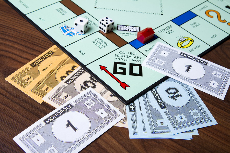CALDWELL IDAHO/USA – MARCH 16 2015: Game of monopoly with cash thrown about near the collect go section
